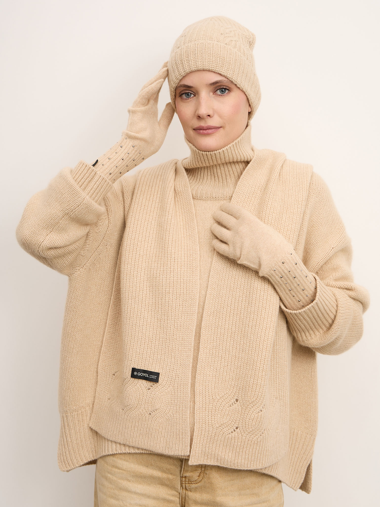 100% натуральный кашемир. Тонкое и мягкое волокно отличается высокой теплоизоляцией и естественной терморегуляцией: сохраняет тепло на улице и обеспечивает комфорт в помещении. Гипоаллергенный материал деликатно соприкасается с кожей и при правильном уходе сохраняет форму и мягкость на протяжении многих сезонов.