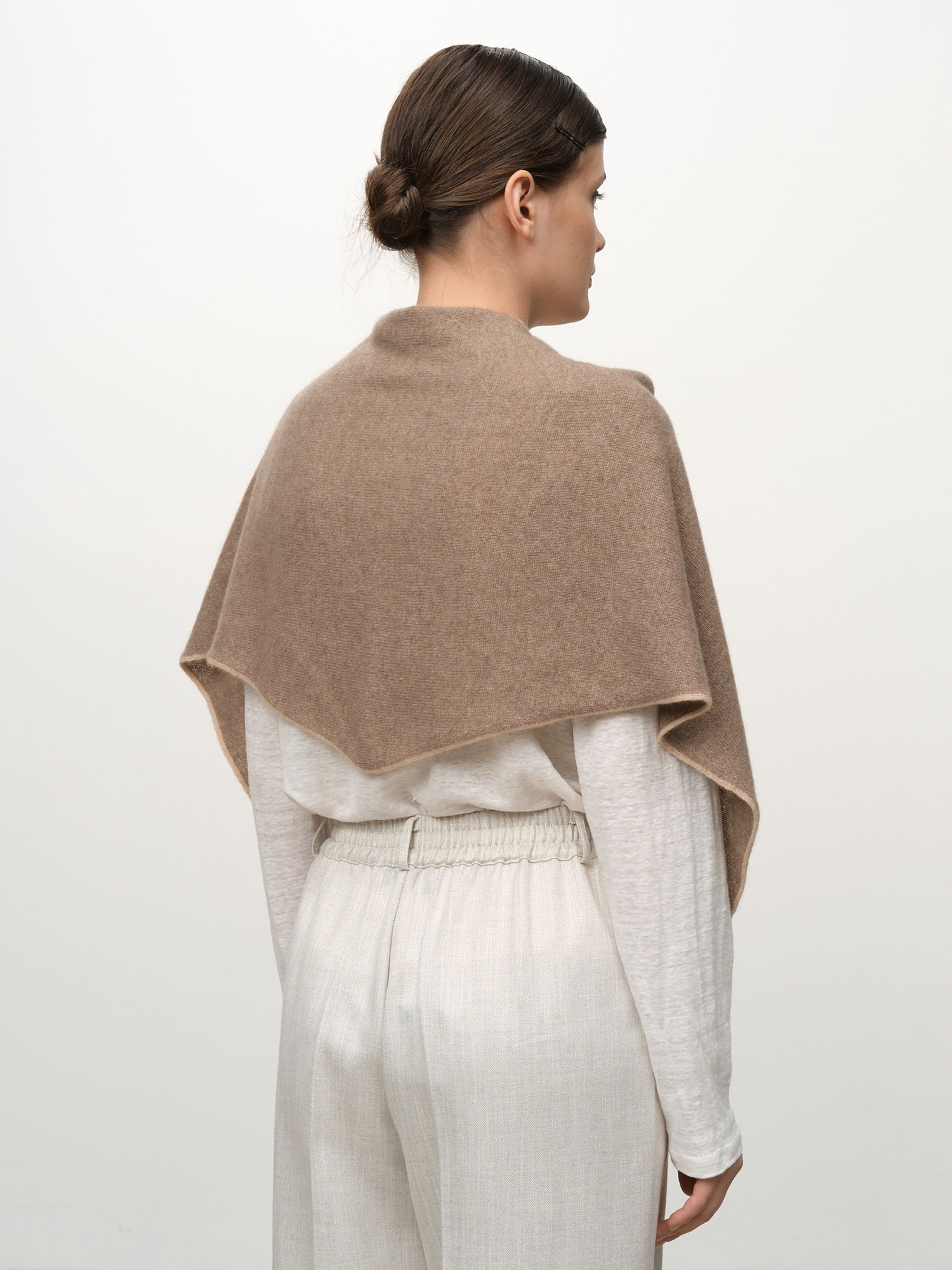 Модель выполнена в аккуратной треугольной форме, которая позволяет красиво драпировать аксессуар на плечах или вокруг шеи. Минималистичный дизайн подчёркивает благородную фактуру кашемира.