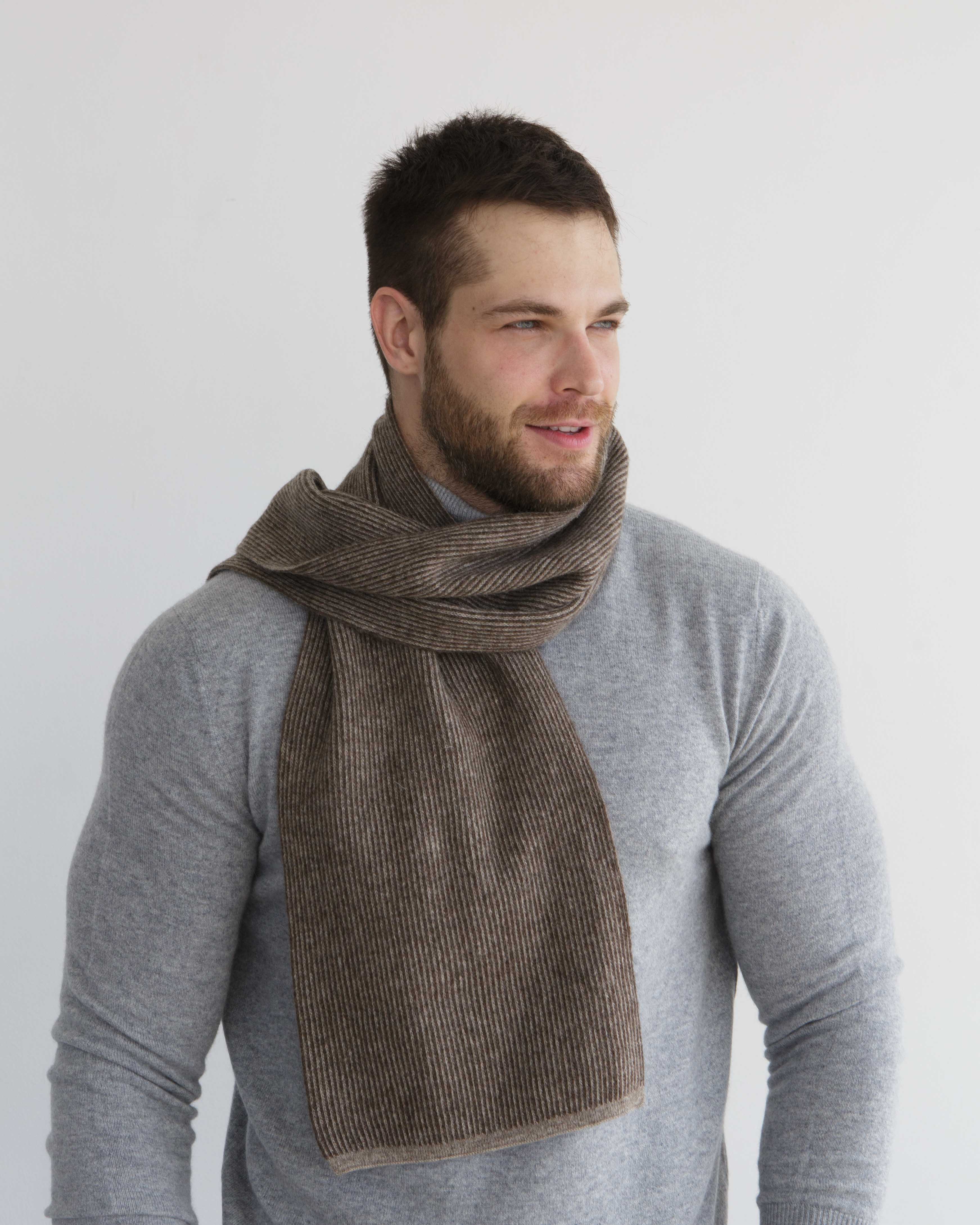 Приобрели шарф для мужчины, чтобы носить его с курткой без воротника. Шарф теплый плотно связан, мягкий, коричневый цвет и серые полоски. |