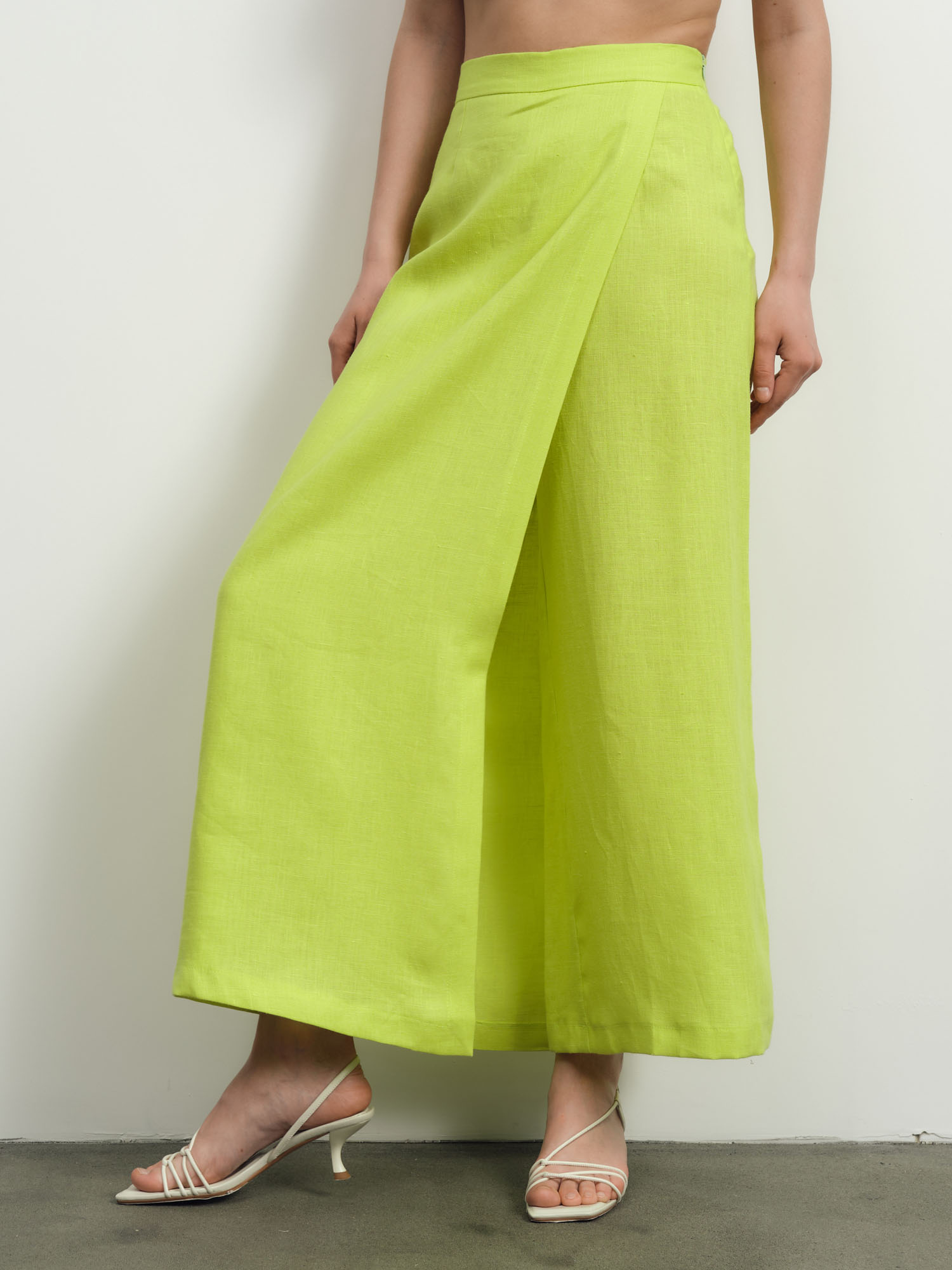 Модель с запахом спереди и сзади, аккуратная посадка по талии, легкая фактурная ткань, мягкие складки, скрытая конструкция брюк.