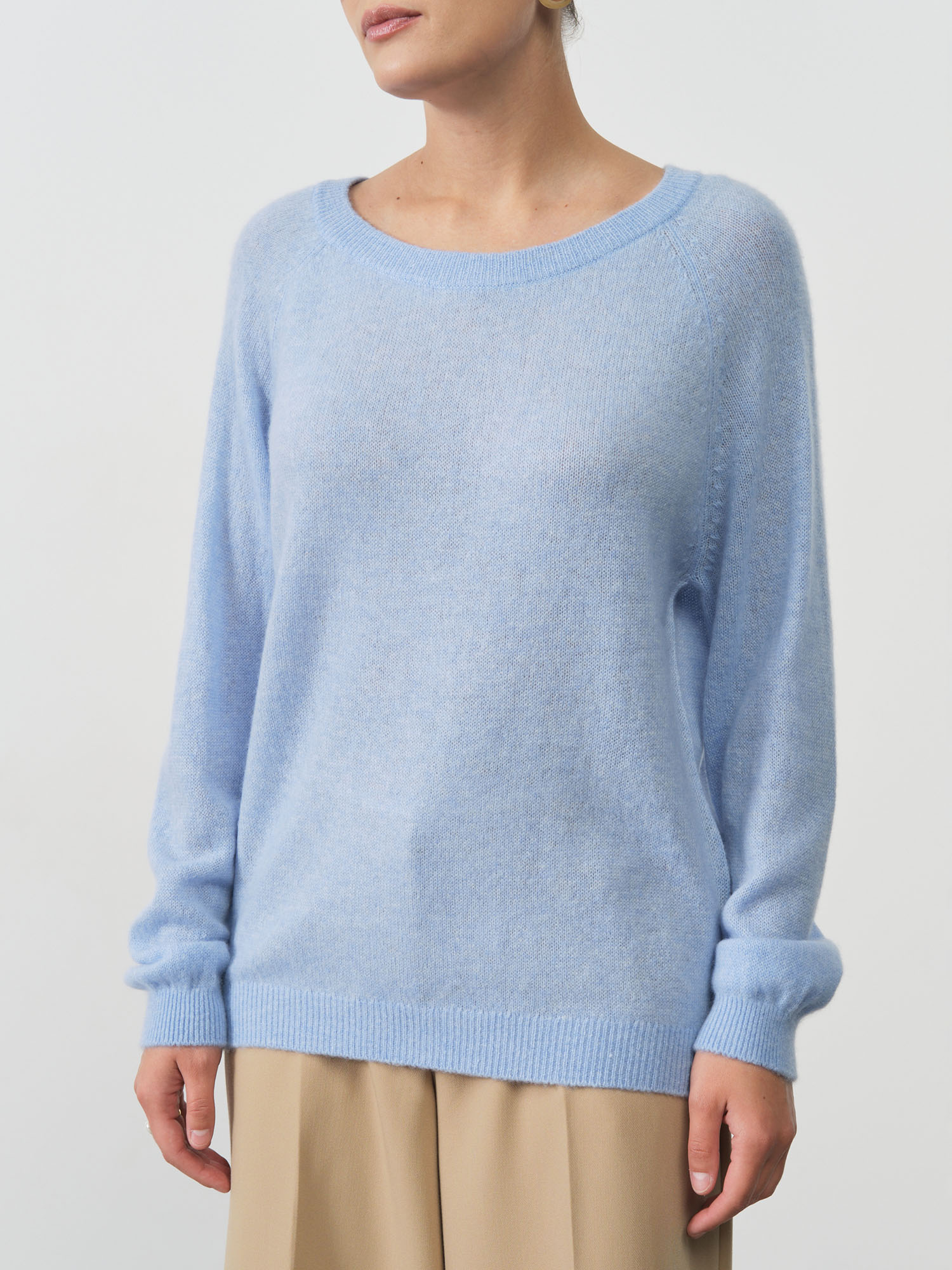 Джемпер очень тонкий и лёгкий, цвет очень приятный - нежно голубой, но модель сильно большемерит.